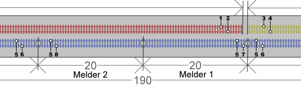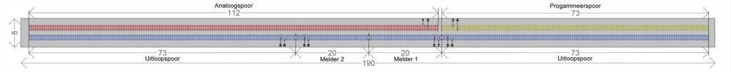 Hier boven in het rood is het analoog spoor om analoge treinen te testen dat alles goed functioneert. Dat ik ze later kan ombouwen naar digitaal. Geel het programmeerspoor om de decoder te programmeren dat deze verdoen in iTrain. Blauw het ijkspoor om de snelheid te ijken en de lengte van de het stoppen te meten.